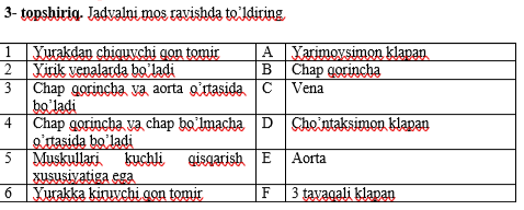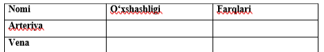 5- topshirig’i. Quyidagi videodarsni kuzatib, qon tomirlarga mos jadvalni to’ldiring?