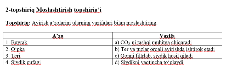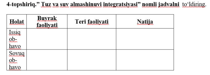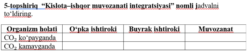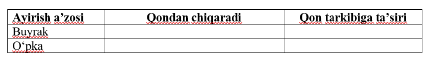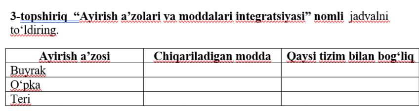 6-topshiriq. “Ayirish va qon tarkibi integratsiyasi”nomli jadvalni to‘ldiring.