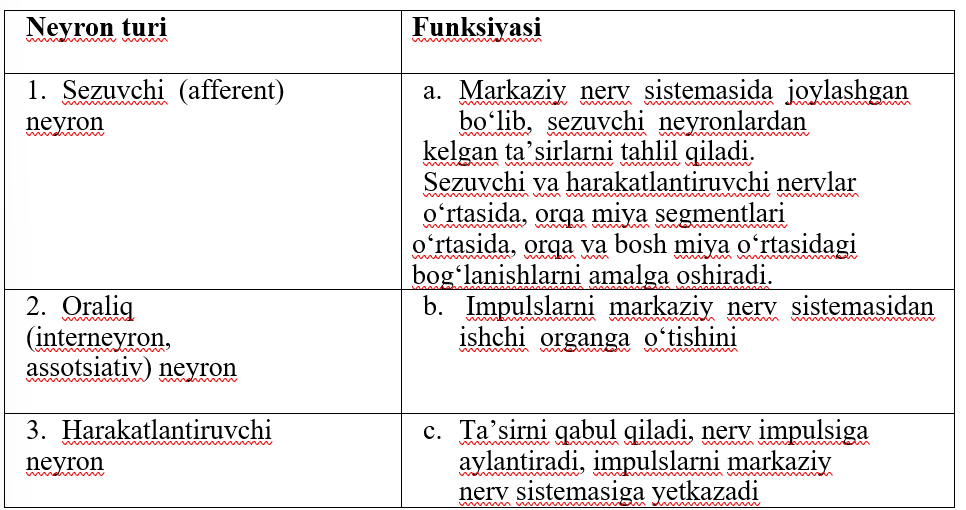 1. Dendrit va aksonning vazifasini funksiyasiga bog‘liq holda sharhlang.