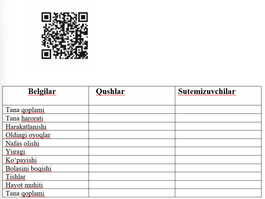 📌 QR-kod orqali video: (Qushlar va sutemizuvchilarning tuzilishi va hayot tarzi haqida)