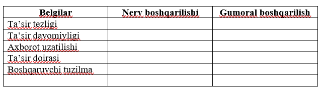 va gumoral boshqarilishi to’g’risidagi qiyosiy jadvalni to’ldiring.