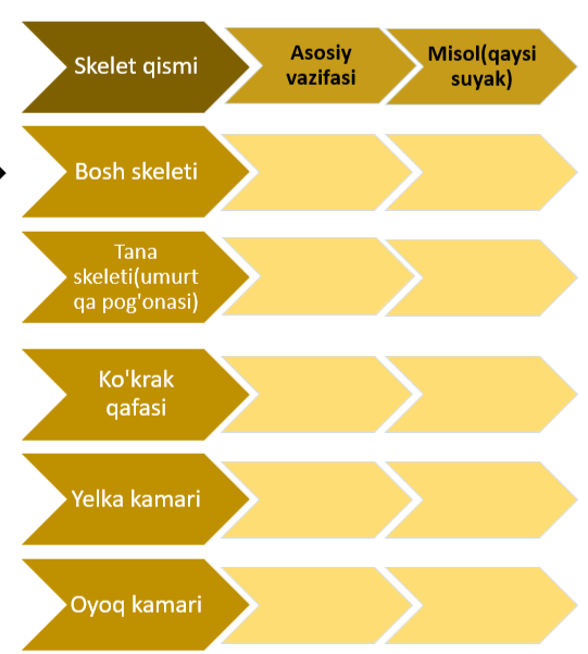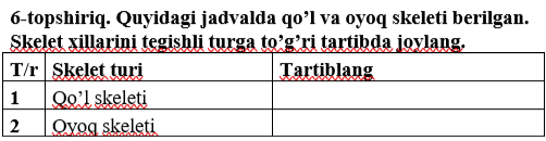 2-topshiriq. Quyidagi jadvalni to’ldiring. Har bir skelet qismi uchun asosiy vazifani va misolini yozing.